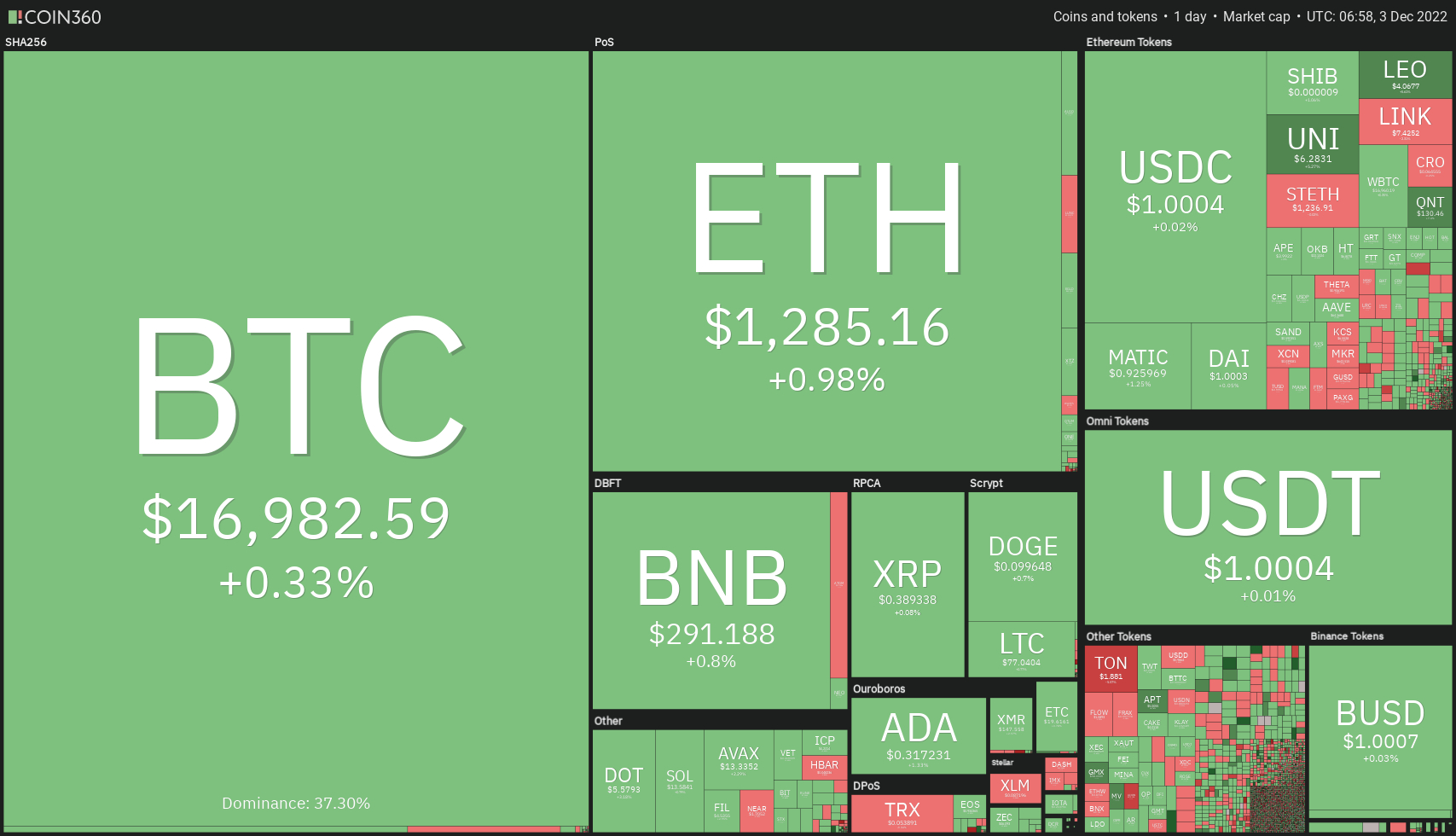 On the morning of December 3rd, Bitcoin struggled to break above the $17,250 level and has now dropped to $16,950, losing 1% in 24 hours. Similarly, Ethereum pulled back after flirting with $1,300 and is now at $1,275.