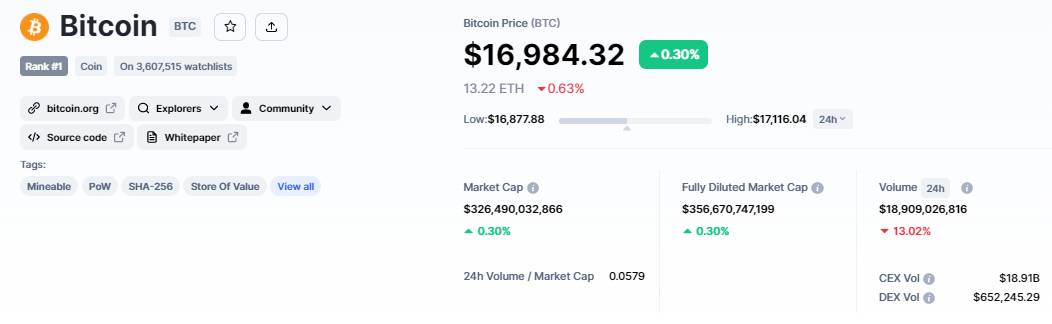 Bitcoin’s current price is $16,950, which means a 1% loss in 24 hours. The trading volume over the past day amounted to $18 billion. The market capitalization of BTC then reached $356 billion with 19,223,025 tokens in circulation.