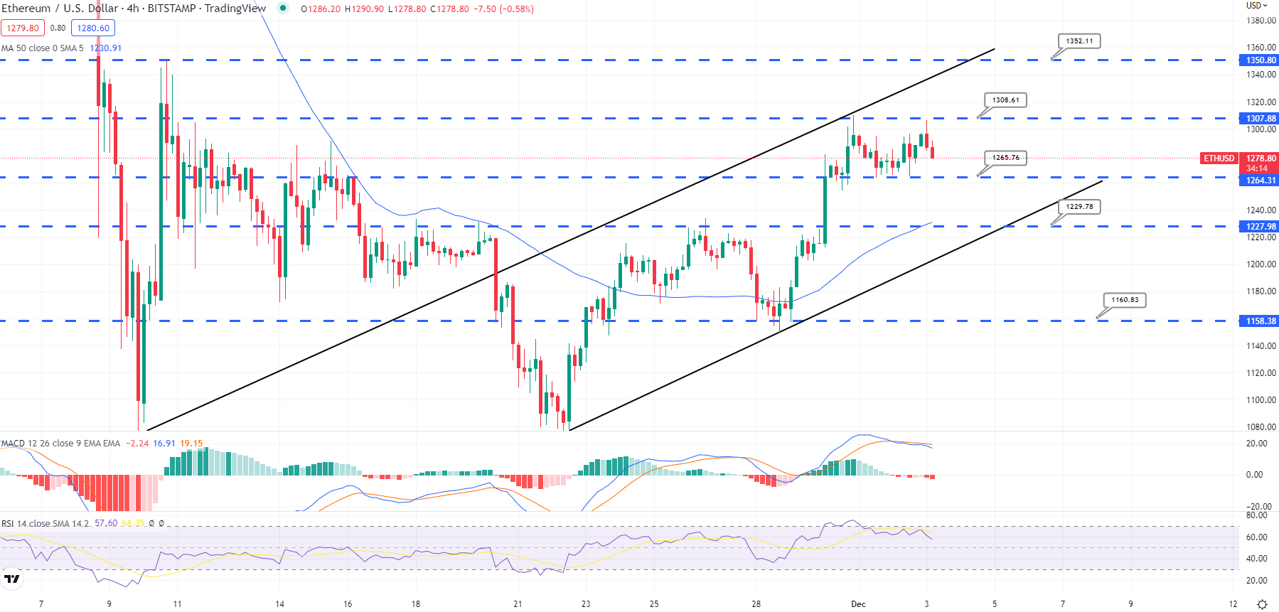 An upward crossing of the $1300 level could indeed push the price of ETH towards the $1354 level.