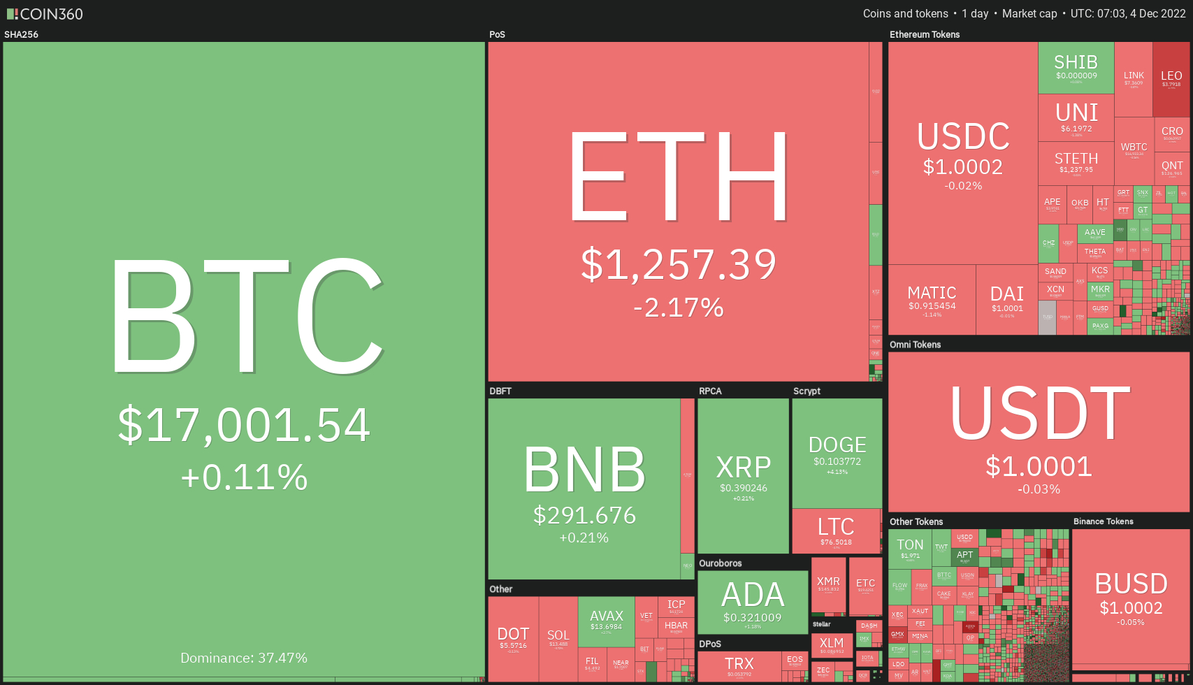 Bitcoin has struggled to rise above $17,250 this morning and is now at $17,033, up 0.3% in one day. Similarly, after hovering around $1,300, Ethereum dropped 1% in 24 hours and is now consolidating around $1,261.