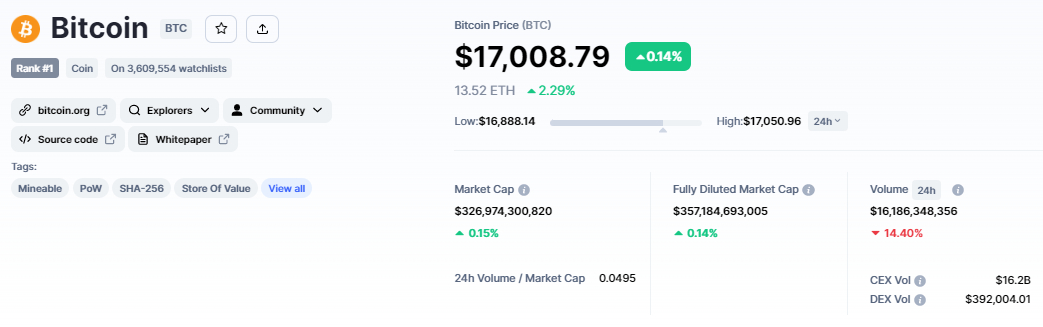 Bitcoin’s current price is $17,033 and the 24 hour trading volume is $16 billion. Its actual market capitalization is $357 billion, almost unchanged from yesterday.
