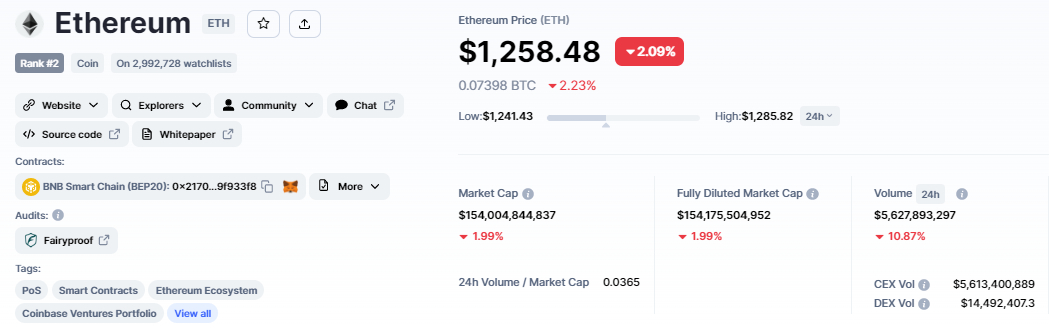 Ethereum price and tokenomics - Source: coinmarketcap
