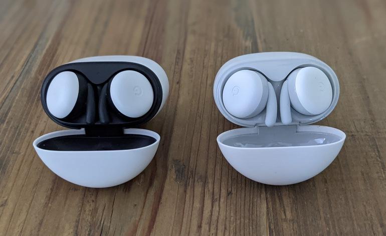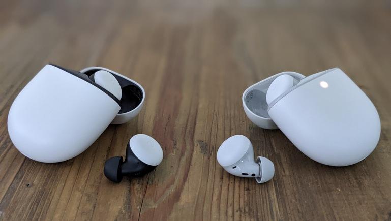 On the left, the Pixel Buds 2 and their two-tone finish. On the right, the Pixel Buds A-Series