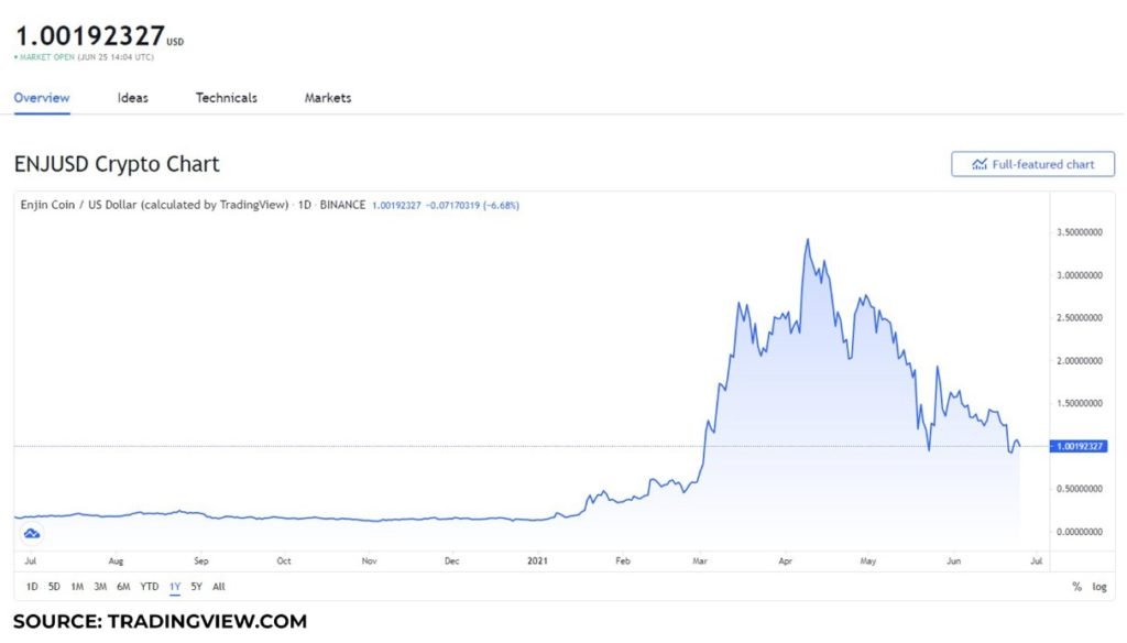 On June 25, ENJ was worth $ 1. On June 21, it fell below $ 1 to $ 0.93 for the first time since May 23, when it fell to $ 0.95.
